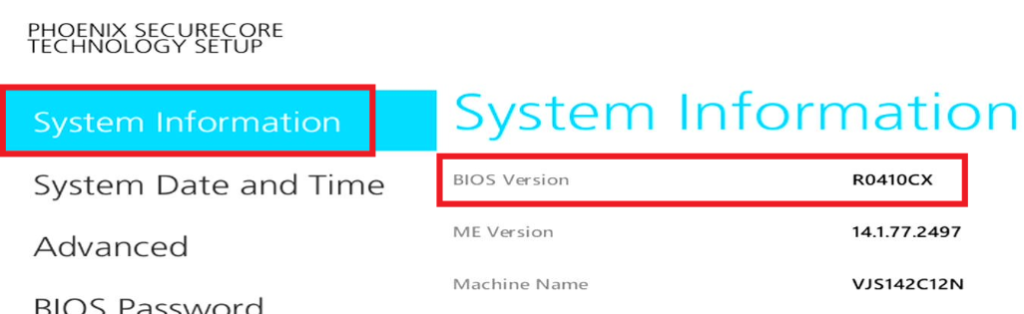 - If the BIOS Version in the System Information column shows “R0410CX”, the update has been successful.