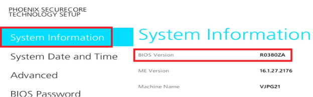 - If the BIOS Version in the System Information column shows “R0380ZA”, the update has been successful.